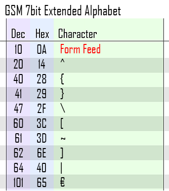Remember how I said that there was only 128 characters in the GSM characterset? Well thats not entirely true. You may have noticed on the table above that 0x27 is "Extension Character". What that means is that there are a small number of additional characters that fall outside of the chart shown above and have to be called by using the 0x27 escape first.