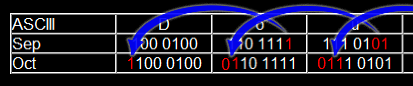 Next, starting at the first septet, we need to take the least significant bit(s) from next septet and place it at the start of the current septet.